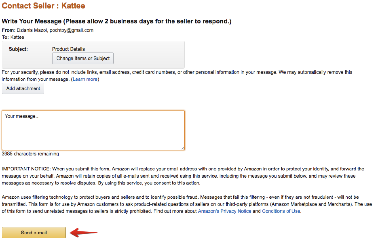 Учитывая огромное наличие на Amazon сторонних продавцов, необходимость в поддержании связи с ними иногда все же возникает - либо необходимо уточнить детали касательно товара, либо о сроках поставки заказа, способах доставки и т.д. Рассмотрим пример написания письма одному из продавцов на Amazon.
