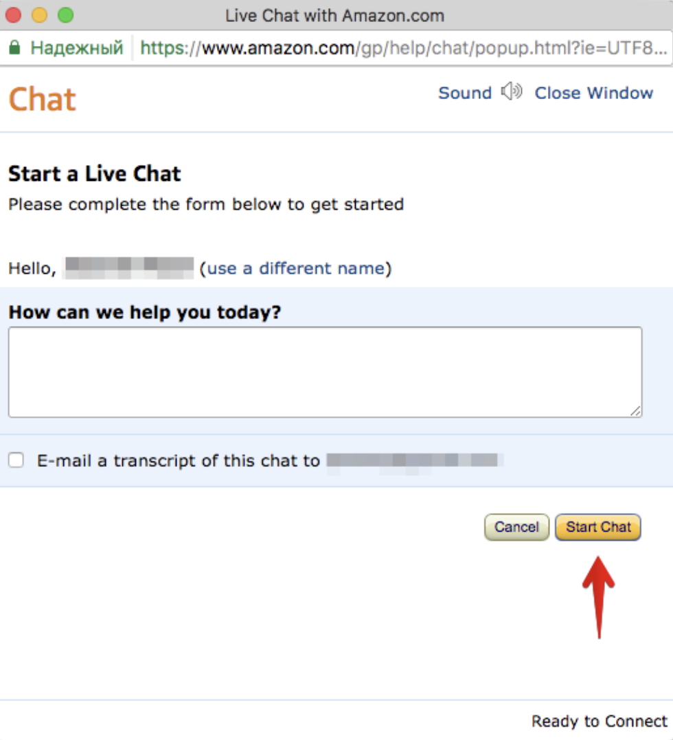 - После выбора способа связи с операторами службы поддержки Amazon (на примере чата) появится форма, в которую необходимо ввести данные о своей проблеме либо вопросе, и лишь после этого необходимо нажать «Start chat».