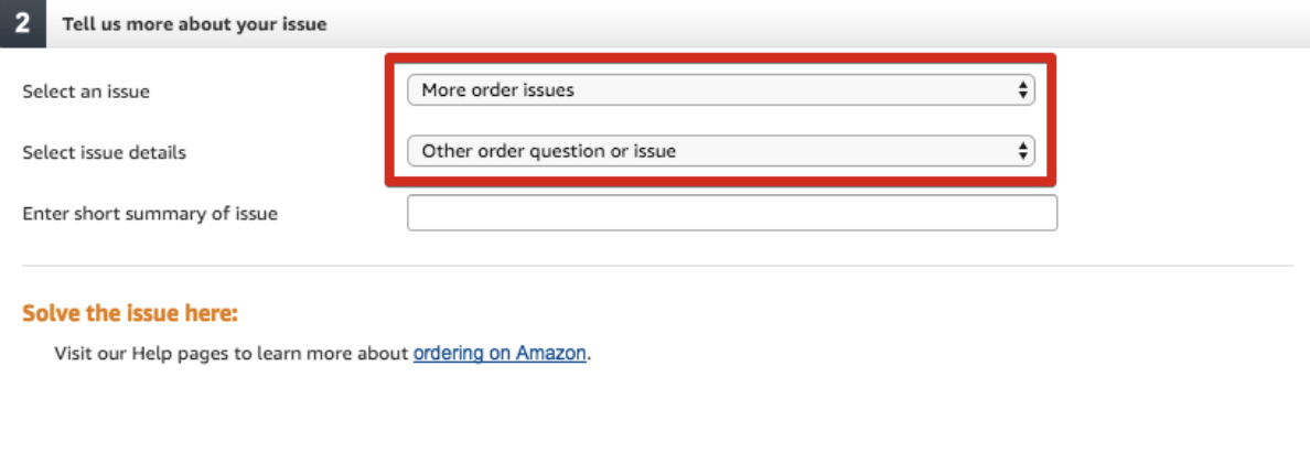 - Выбрав галочкой нужный товар, переходим к выбору причины обращения в службу поддержки - «Select an issue». В этом пункте выбирается соответствующий пункт, но если в списке нет подходящего - можно выбрать «More order issue»