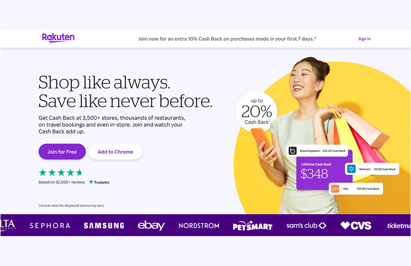 Что такое Rakuten? - это кэшбэк-сервис, позволяющий пользователям получать возврат части потраченных средств при покупках в тысячах американских интернет-магазинах. Также как и на Mr. Rebates вы получаете кешбэк, совершая покупки через сайт, а затем можете вывести средства на свой кошелек PayPal.
