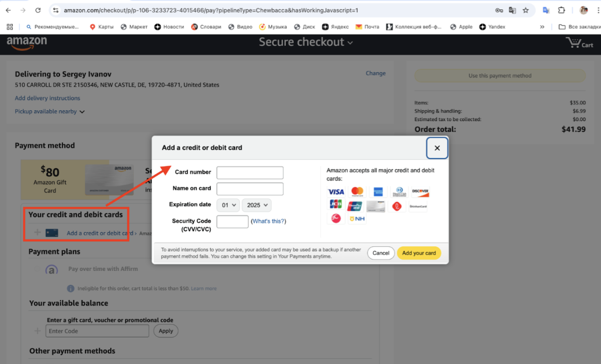 Вводите номер, имя владельца, период действия и CVC код с обратной стороны карты. Нажмите в конце Add your card.