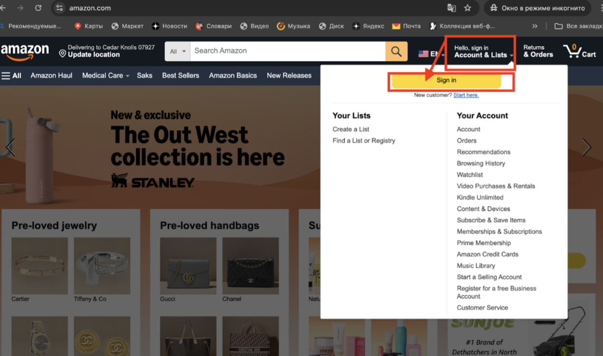 - В правом верхнем углу страницы наведите на «Hello. Sign In Account&Lists». В появившемся меню кликните на ссылке «Sign here»