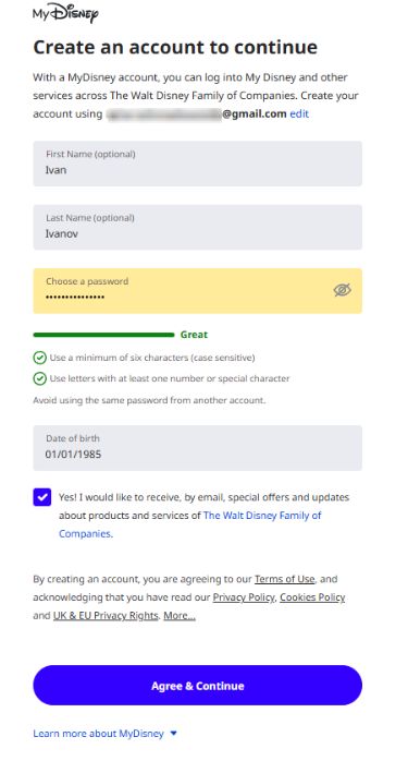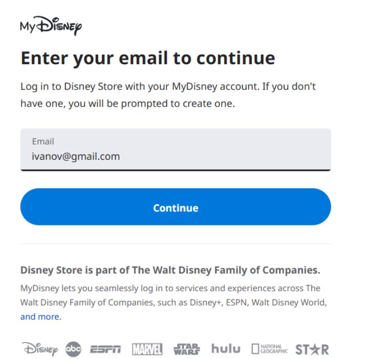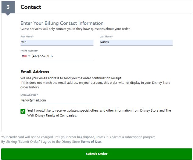 При желании можете подписаться на рассылку акций от магазина поставив галочку напротив I'd like to receive updates, special offers and other information from The Walt Disney Family of Companies.