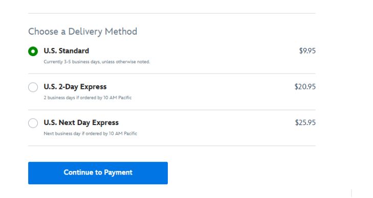 Выбираем способ доставки. От него будет зависеть насколько быстро заказ прибудет к нам на склад. Жмем на кнопку «Continue to Payment»