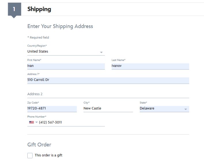 Проверяем цвета, количество и размеры и переходим к дальнейшему оформлению заказа, нажимая «Begin Checkout». Первым делом вносим информацию о доставке. Здесь вам необходимо указать Shipping Address (ваш виртуальный адрес у нас, который вы можете найти в разделе Мой адрес в США).