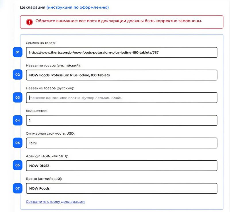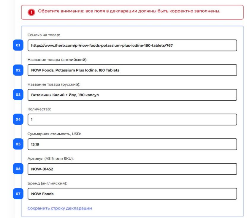 В качестве примера, возьмем страницу витаминов на iherb. Обратите внимание на скриншоты, мы показали цифрами что и куда надо вставить со страницы товара в декларацию.