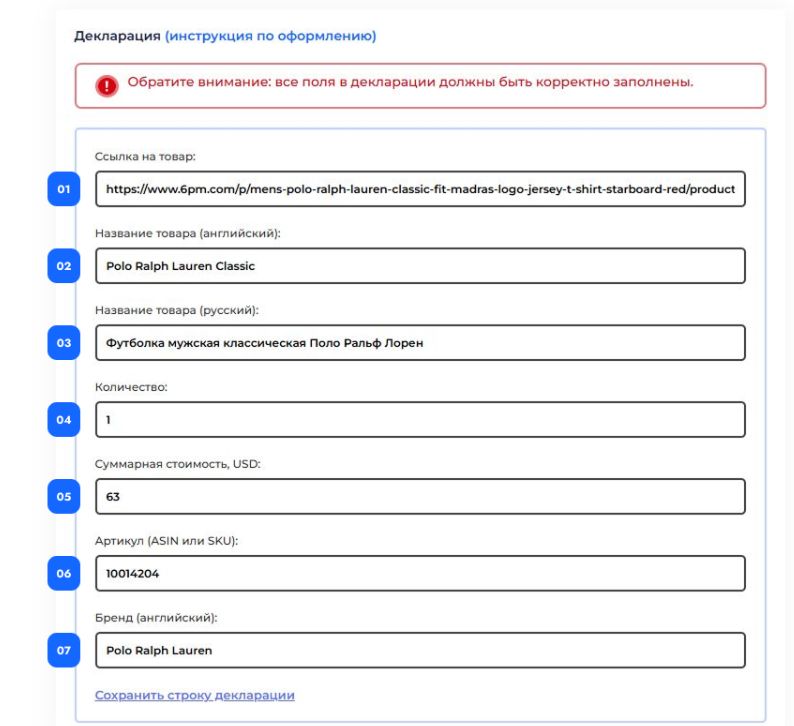 В качестве примера, возьмем страницу футболок на 6pm.com. Обратите внимание на скриншоты, мы показали цифрами что и куда надо вставить со страницы товара в декларацию.