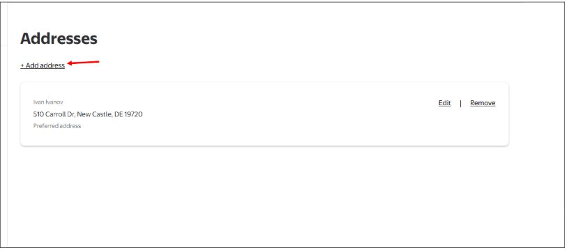 После входа в аккаунт перейдите в раздел Account → Addresses → "Add new address" . В адресной книге необходимо заполнить Shipping address, т.е. адрес доставки - его каждый клиент получает после регистрации на нашем сайте.
