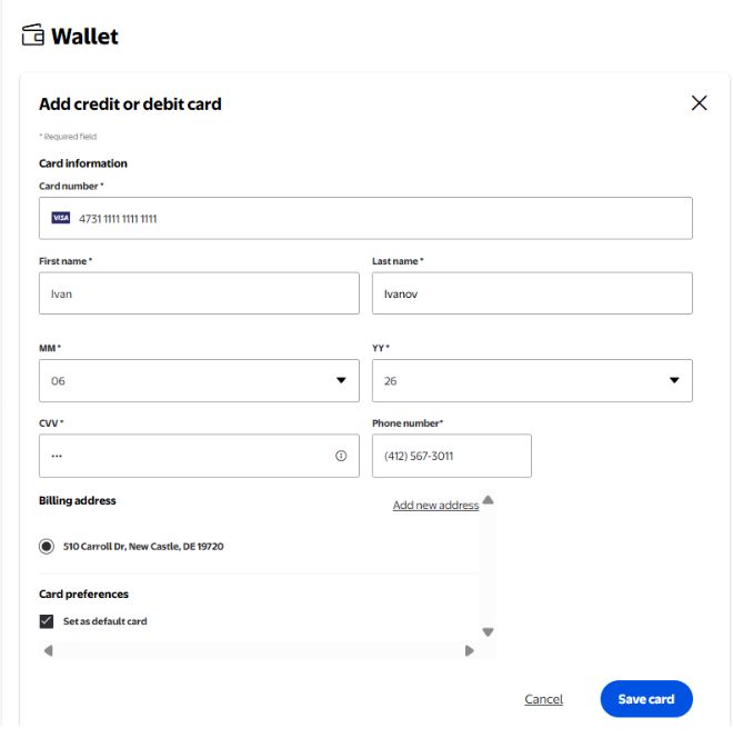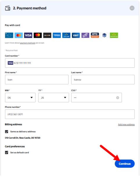 Следующий шаг в заполнении личных данных - платежные реквизиты. Заполняются все данные карты, при этом обязательно выбрать именно тот адрес, который внесен для Billing address т.е. смешанного типа.